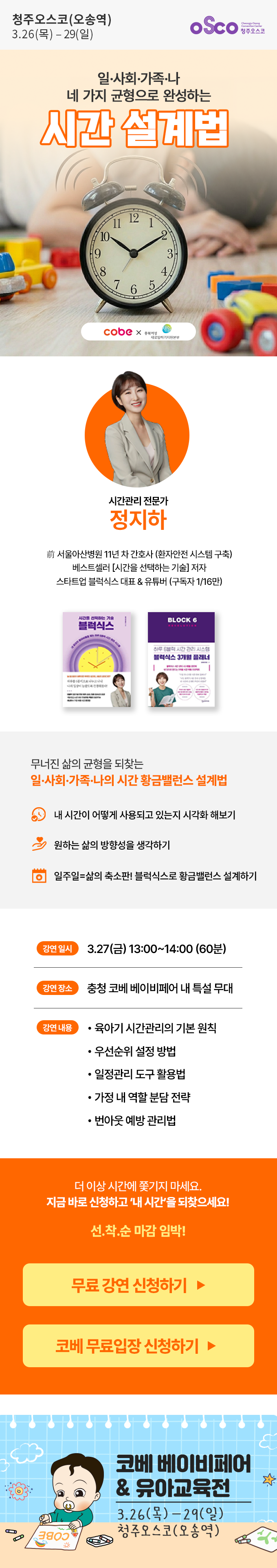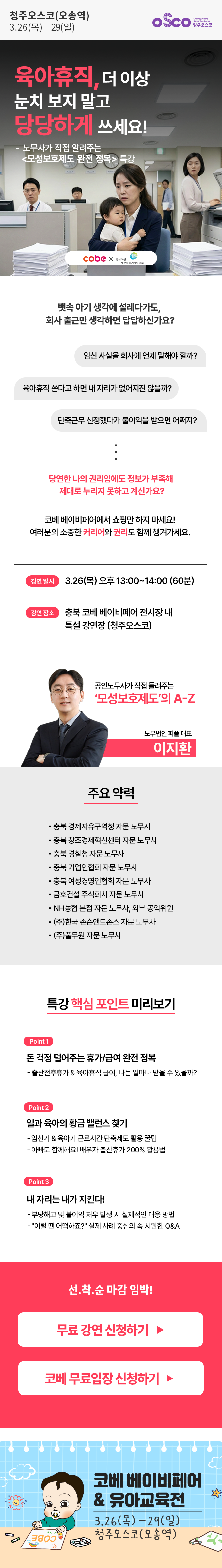 | 충북여성새로일하기센터에서는「2026 코베 베이비페어&유아교육전」과 협업하여 충북 도내 육아기 여성을 대상으로 <모성보호 법률 특강> 및 <양육자 시간 관리 특강>을 아래와 같이 운영합니다. 많은 참여 부탁드립니다. [ 모집개요] 1) 행사명: 「2026 코베 베이비페어&유아교육전」육아기 여성 일·가정 양립 지원 특강 2) 일시: 2026. 3. 26.(목)~3. 27.(금) 13:00~14:00 3) 모집기간: 기한 내 상시 모집(당일 현장 접수 가능) 4) 모집대상: 충북 도내 육아기 여성 5) 신청방법: 해당 URL 주소 접속 후 신청 https://www.tippingkorea.co.kr/kr/form_n/view_survey.php?idx=8345 6) 문의사항: 070-4186-3968(일터문화개선팀) 7) 기타사항: 세미나 신청자에 한해 무료입장권 증정 ![]() ![]() |