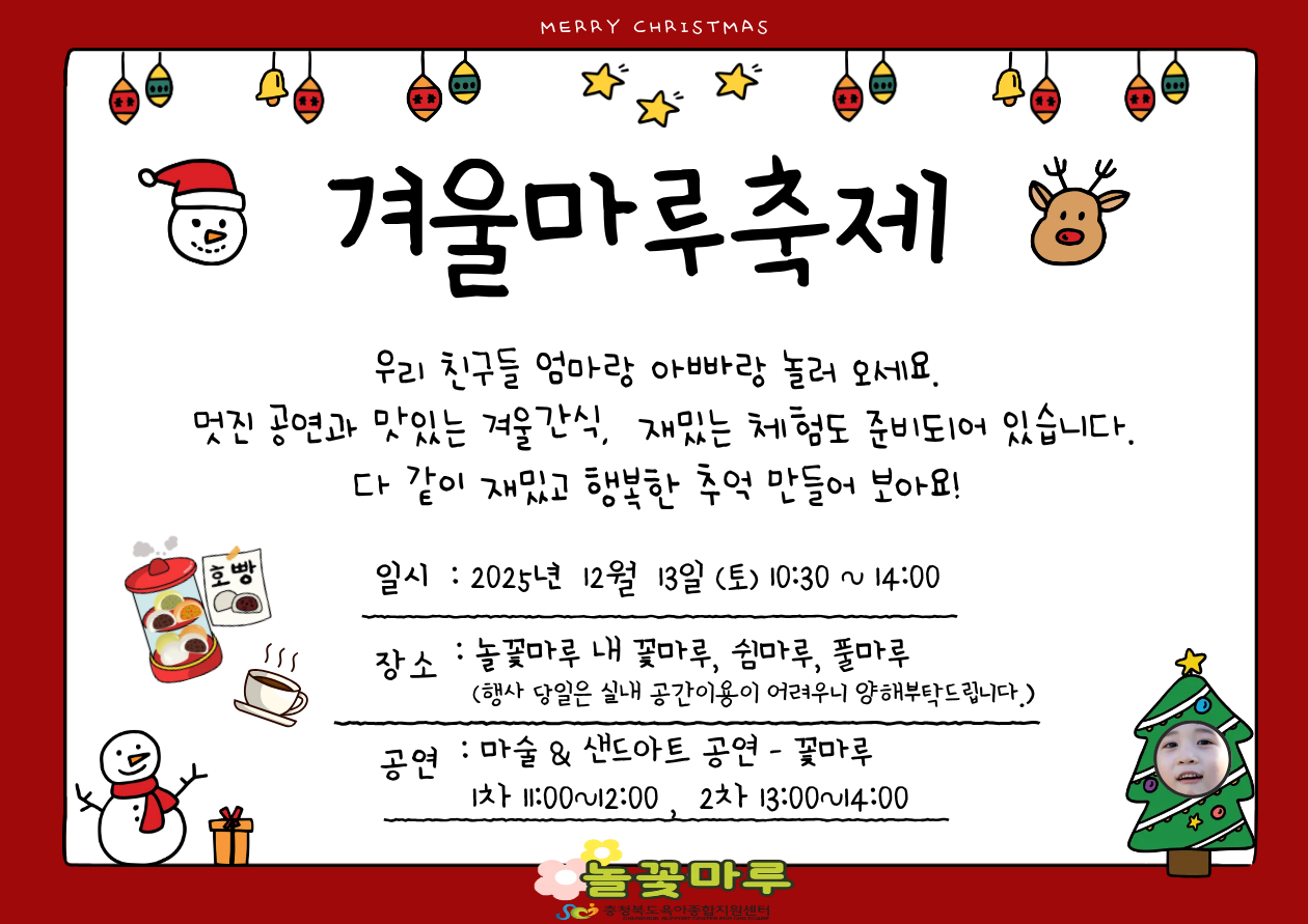 ![]() 겨울마루축제 안녕하세요. 멋진 공연과 맛있는 겨울 간식, 재미있는 체험이 준비된 놀꽃마루에 놀러오세요. 다 같이 즐겁고 행복한 추억 만들어보아요! 일시 25. 12. 13.(토) 10:30~14:00 장소 놀꽃마루 내 꽃마루, 쉼마루, 풀마루 (행사 당일은 실내 공간 이용이 어려우니 양해부탁드립니다.) 공연 마술&샌드아트 공연 - 꽃마루 1차 11:00~12:00, 2차 13:00~14:00 |