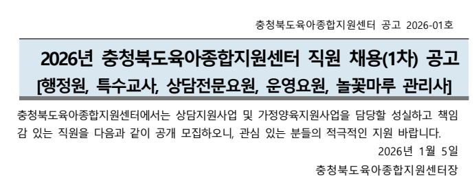 | 2026년 충청북도육아종합지원센터 직원 채용 1차 공고[행정원, 특수교사, 상담전문요원, 운영요원, 놀꽃마루 관리사] | ||||||